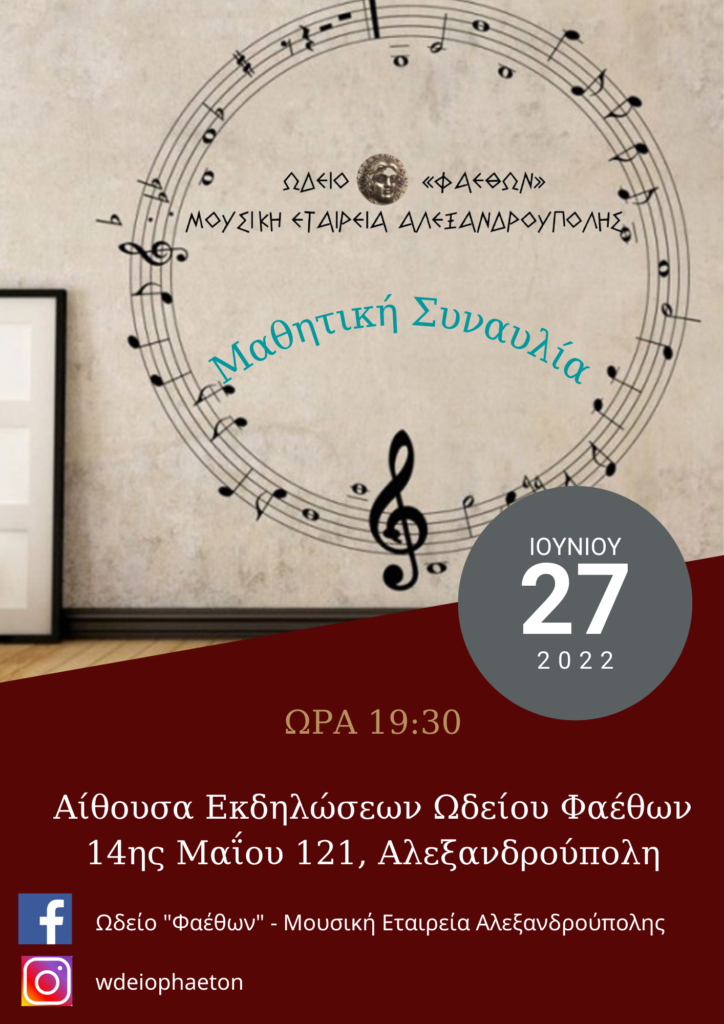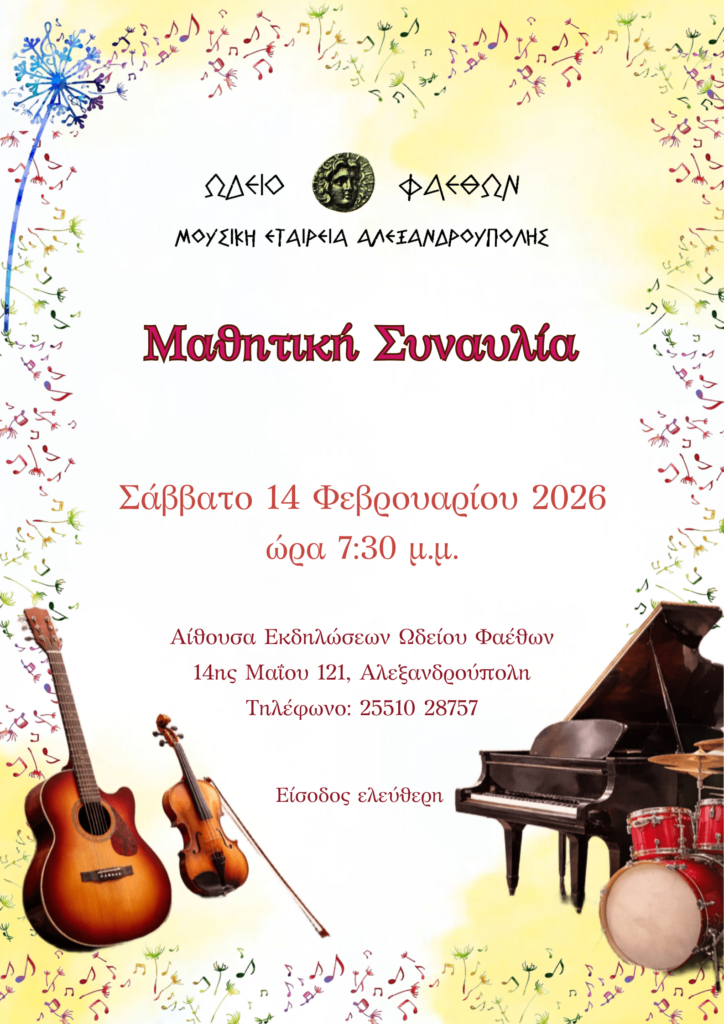Με χαρά σας προσκαλούμε στη Μαθητική Συναυλία του Ωδείου ΦΑΕΘΩΝ που θα πραγματοποιηθεί την Κυριακή 29 Ιουνίου 2025 και ώρα 8:00 μ.μ. στην Αίθουσα Εκδηλώσεων του Ωδείου ΦΑΕΘΩΝ, 14ης Μαΐου 121 στην Αλεξανδρούπολη.