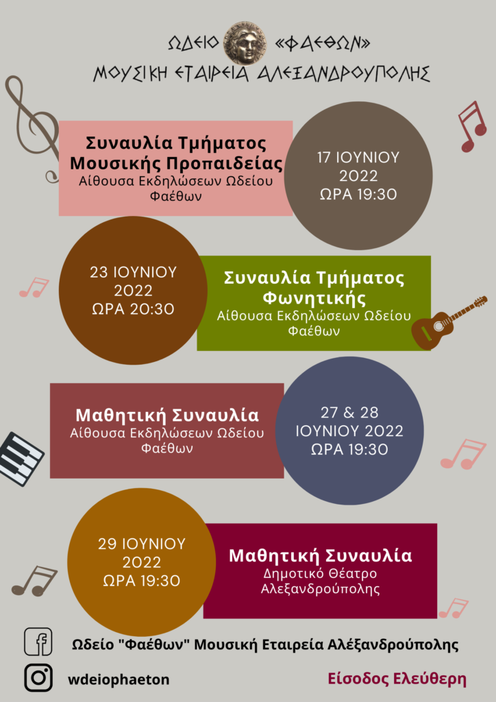 Το Ωδείο Φαέθων με χαρά σας προσκαλεί σε μια σειρά συναυλιών που αναδεικνύουν το ταλέντο, την πρόοδο και το μεράκι των σπουδαστών του, προσφέροντας μοναδικές μουσικές στιγμές σε όλους όσοι αγαπούν τη μουσική!