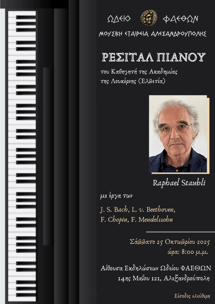 Σας προσκαλούμε σε μια ξεχωριστή μουσική βραδιά με τον Καθηγητή της Ακαδημίας Λουκέρνης της Ελβετίας, Raphael Staubli, το Σάββατο 25 Οκτωβρίου 2025 στις 8:00 μ.μ., στην Αίθουσα Εκδηλώσεων του Ωδείου Φαέθων (14ης Μαΐου 121, Αλεξανδρούπολη).