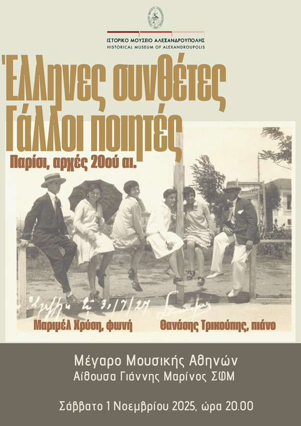 Στην εκδήλωση «Έλληνες συνθέτες, Γάλλοι ποιητές – Παρίσι, αρχές 20ού αι.» που διοργανώνει το Ιστορικό Μουσείο Αλεξανδρούπολης, ερμηνεύονται έργα των Eλλήνων συνθετών, Σπύρου Σαμάρα, Αιμίλιου Ριάδη, Λαυρέντιου Καμηλιέρη, Κλέωνος Τριανταφύλλου (Αττίκ), Δημήτριου Λεβίδη και Θεόδωρου Σπάθη, σε ποίηση των Γάλλων ποιητών Comtesse Anna de Noailles, Gustave Rivet, Jeanne Valcler, François Coppée, André Hugot, Albert Samain, Pierre Reyniel.