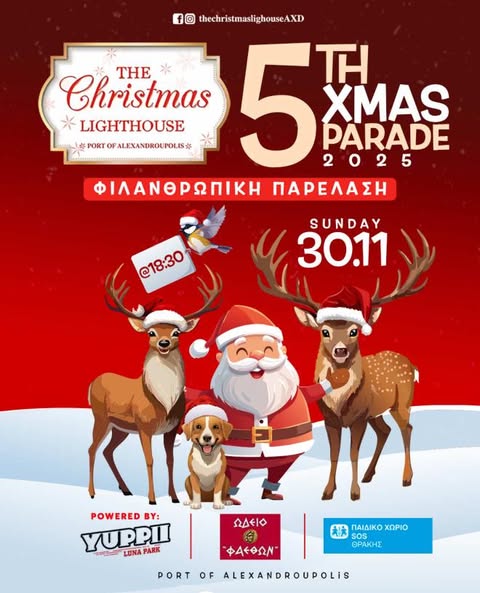 Με γιορτινή διάθεση σας προσκαλούμε στην καθιερωμένη μας Χριστουγεννιάτικη Φιλανθρωπική Παρέλαση στο Christmas Lighthouse κάτω από τον Φάρο Αλεξανδρούπολης, που θα πραγματοποιηθεί την Κυριακή 1 Δεκεμβρίου 2024 και ώρα 6:30 μ.μ.. Σας περιμένουμε!