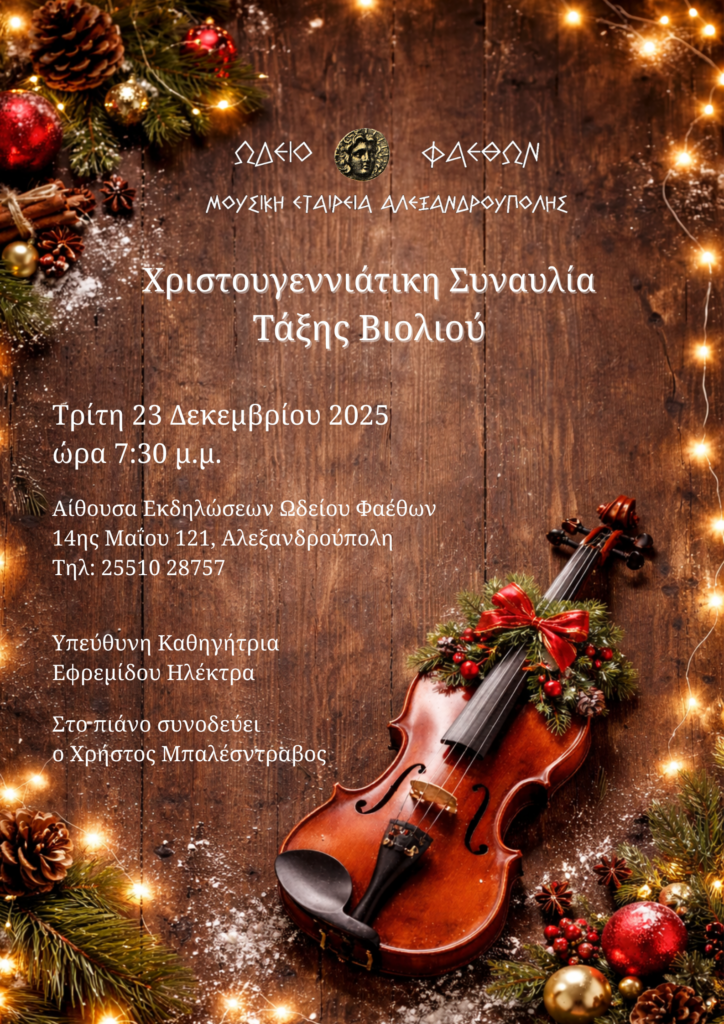 Το Ωδείο ΦΑΕΘΩΝ πραγματοποιεί Συναυλία Βυζαντινής Μουσικής με τίτλο: «Χριστός ἐτέχθη», την Παρασκευή 19 Δεκεμβρίου 2025 και ώρα 8:30 μ.μ. στο Νομαρχείο Αλεξανδρούπολης, υπό την αιγίδα της Περιφέρειας Ανατολικής Μακεδονίας και Θράκης – Περιφερειακής Ενότητας Έβρου.