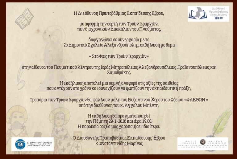 Το Ωδείο ΦΑΕΘΩΝ πραγματοποιεί Συναυλία Βυζαντινής Μουσικής με τίτλο: «Βηθλεέμ ἑτοιμάζου…», την Κυριακή 22 Δεκεμβρίου και ώρα 7:00 μ.μ. στο Νομαρχείο Αλεξανδρούπολης, υπό την αιγίδα της Περιφέρειας Ανατολικής Μακεδονίας και Θράκης – Περιφερειακής Ενότητας Έβρου.