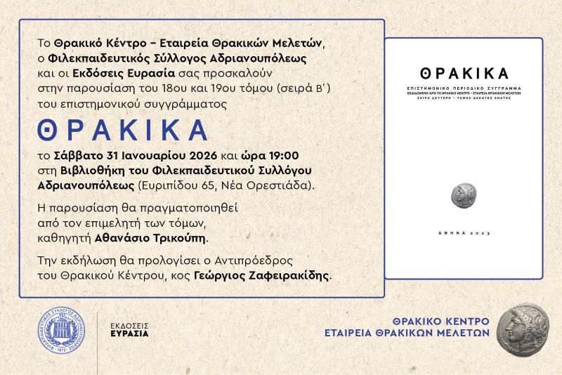 Με απόλυτη επιτυχία πραγματοποιήθηκαν στην Κομοτηνή την Παρασκευή 30 Ιανουαρίου 2026 και στην Ορεστιάδα το Σάββατο 31 Ιανουαρίου 2026 οι Παρουσιάσεις του 18ου και 19ου τόμου (σειρά Β’) του Επιστημονικού Συγγράμματος ΘΡΑΚΙΚΑ (εκδόσεις Ευρασία) από τον Επιμελητή των τόμων και Πρόεδρο του Συλλόγου Μουσικών Εκπαιδευτικών Ανατολικής Μακεδονίας – Θράκης Καθηγητή κ. Αθανάσιο Τρικούπη.