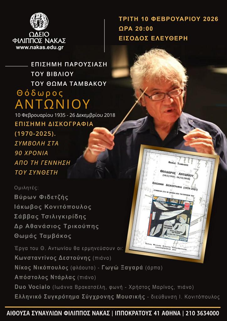 Την Τρίτη, 10 Φεβρουαρίου 2026, κατά την επέτειο των γενεθλίων του συνθέτη, μαέστρου, δασκάλου Θόδωρου Αντωνίου (1935-2018) στην Αίθουσα Συναυλιών Φίλιππος Νάκας και στο πλαίσιο των εκδηλώσεων Celebration, πραγματοποιήθηκε η πρώτη παρουσίαση του βιβλίου του Θωμά Ταμβάκου «Επίσημη Δισκογραφία – Συμβολή στα 90 χρόνια από τη γέννηση του Θ. Αντωνίου» από τη Μουσική Εταιρεία Αλεξανδρούπολης.